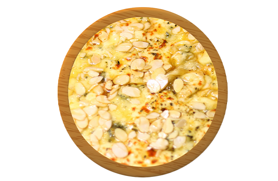 Molho de tomate, mussarela, queijo brie e geleia de pimenta.
