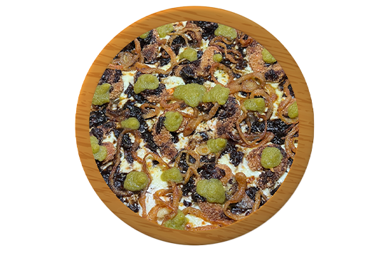 Molho de tomate, mussarela, copa, figo e molho especial.