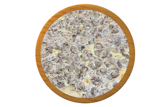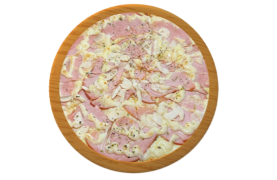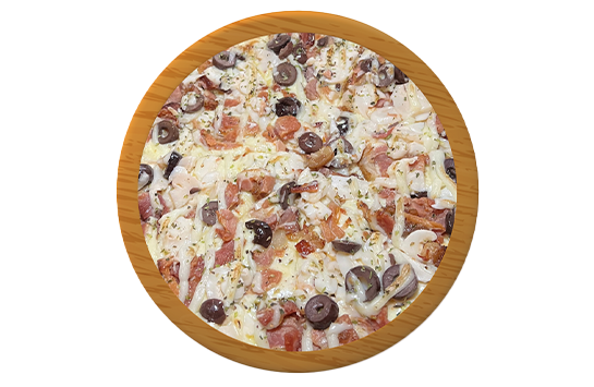 Molho de tomate, mussarela, bacon Champignon, azeitona, catupiri e parmesão.
