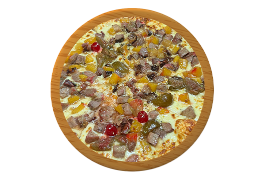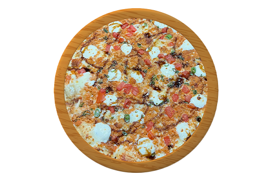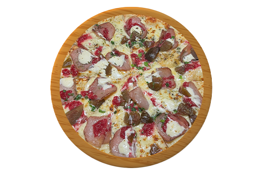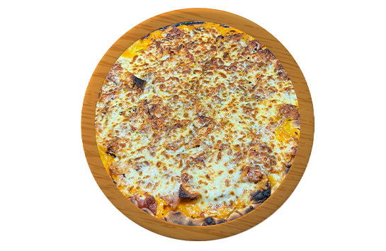 Molho de tomate, mussarela, peito de peru, catupiry e parmesão.
