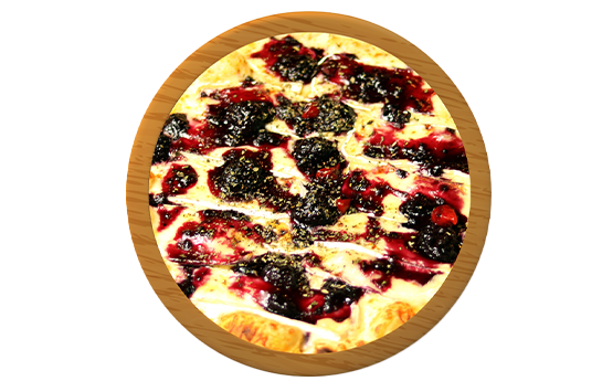 Molho de tomate, mussarela, queijo brie e redução de amora.
