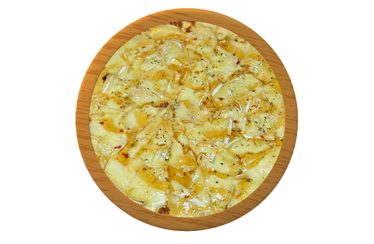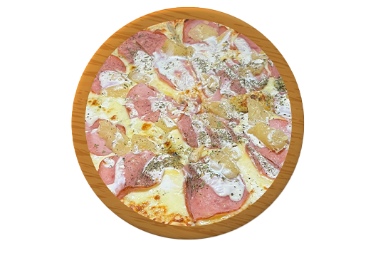 Molho de tomate, mussarela, lombo, abacaxi e creme de leite.