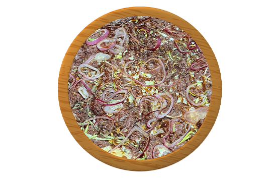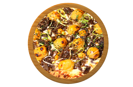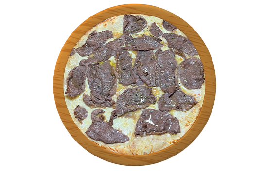 Molho de tomate, mussarela, fatias de picanha ao alho e óleo e orégano.