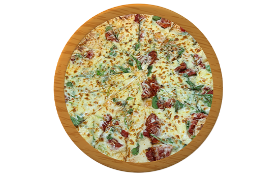 Molho de tomate, mussarela, tomate seco, rúcula, orégano e cheddar.