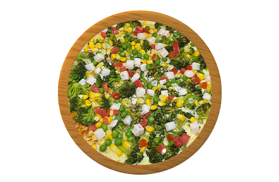 Molho de tomate, mussarela, milho, ervilha, azeitona, brócolis e tomate picado.
